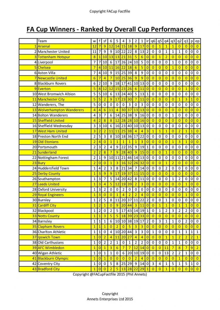 闲话不多说,先来上干货。1955-56赛季,欧洲冠军杯首度打响,16支欧陆豪强参加了当届赛事,皇家马德里最终折桂,并自此迈出了十冠伟业的第一步。掐指算来,今年刚好是欧冠联赛的六十大寿,这个时间着实不短(最起码要比我老多了),然而早在1955年时,足总杯就已经是84岁高龄了!在这84年间,它总共经历了74场决赛(期间曾因两次世界大战而停摆过——译注),35支球队先后问鼎过此项赛事,总参赛队伍更是多达2400余支。若要论资排辈的话,欧冠恐怕只能算是足总杯的曾孙辈啦!