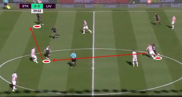 需要说明的是,利物浦的这个三后卫阵型下,有一个很大的软肋在于克拉万。斯托克城在比赛中开始阶段似乎还没明白这一点,但是后续的比赛里,则是找准了这一点进行攻击,取得了不错的效果。