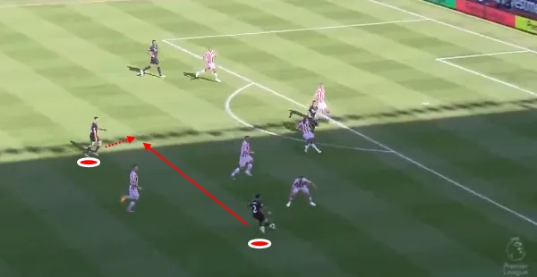 这次斯托克城回防较快,于是库鸟分边给到奥里吉,后者的射门差了一点点。