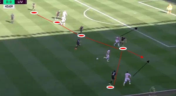 应该说,拉拉纳的缺战,使得利物浦的肋部配合大大减少,这也使得反击中需要打的更直接。但是在奥里吉拉边后,想要通过直接传中攻击,找点是较为困难的。
