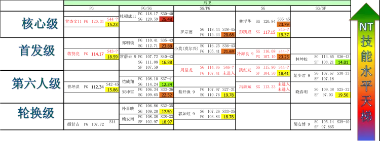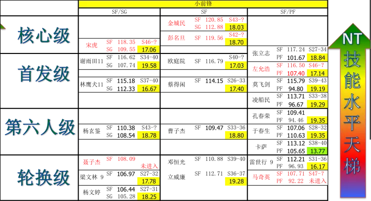 注1:仅统计30赛季后的NT球员,红字为仍未完全退役。名字后数字代表潜力,默认为10