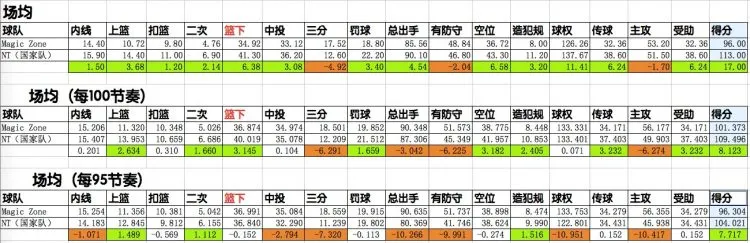 进一步分析数据,我们把场均数据列出后,因为俱乐部和国家队节奏不同,难以直接比较。分别把2组数据换算成较快时的100节奏和平均水平的95节奏再进行比较。