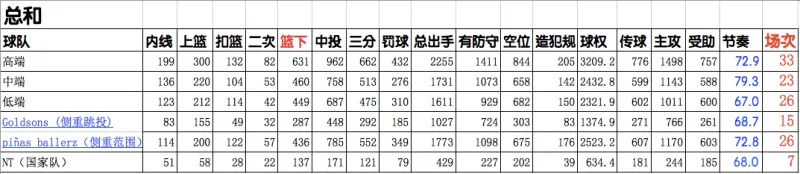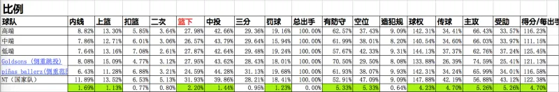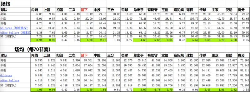 进一步分析数据,我们把场均数据列出后,大体节奏都在70附近, 所以全部换算成70节奏方便直接比较。绿色部分是数据标准差有明显差距项目。没有颜色标注则为基本没有差距的项目。