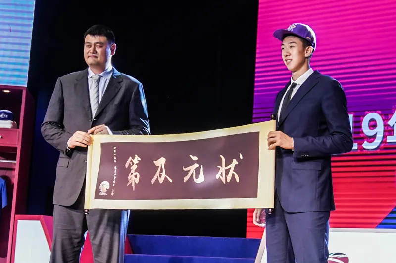2019年CBA选秀大会上王少杰从CBA公司董事长、中国篮协主席姚明手中接过“状元及第”的横幅