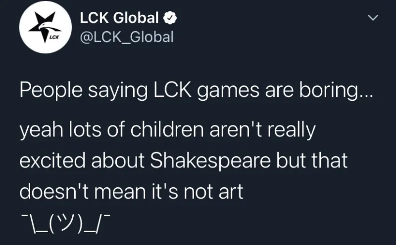 虎扑10月15日讯 在今天进行的淘汰赛中,DWG最终成功晋级四强,而很多人也评论说LCK比赛很无聊,LCK官推就此发布推特回应,Twitter译文(大意)如下: