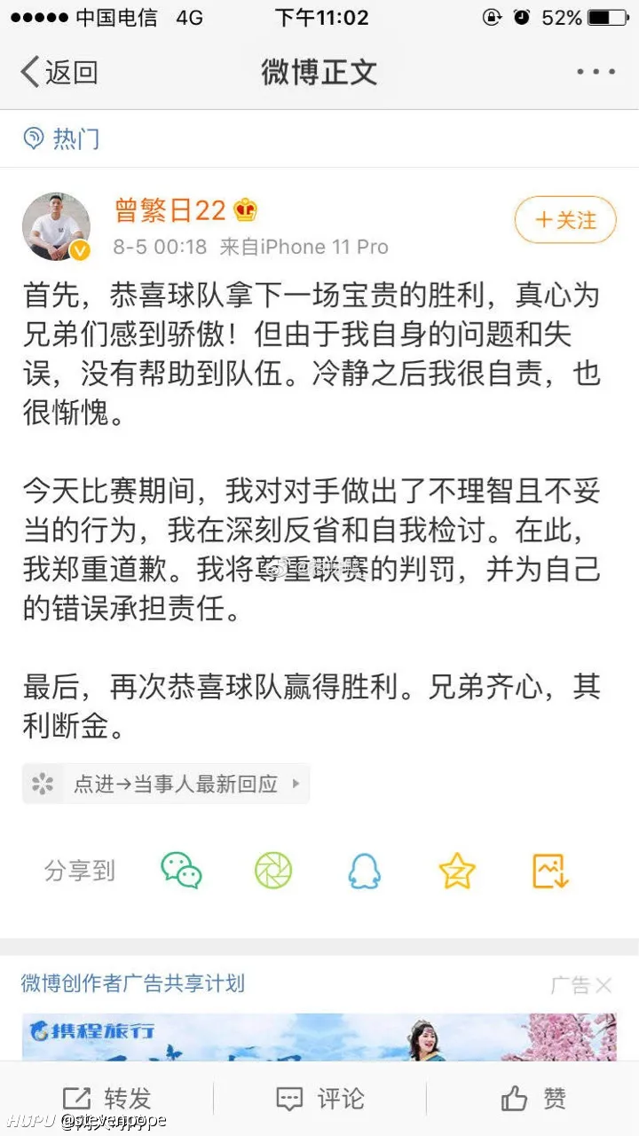 上赛季北京对阵广东的半决赛首战,曾繁日在回防过程中手部攻击到尤度隐私部位,被直接驱逐出场。