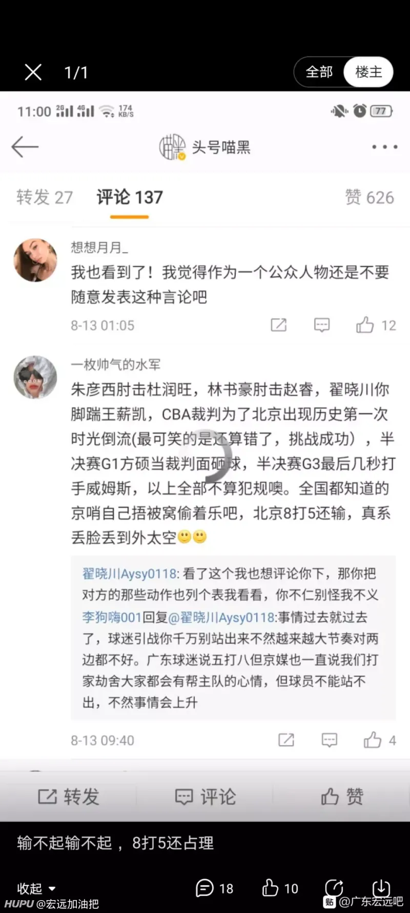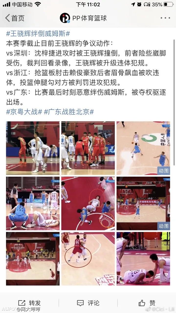 虎扑11月3日讯 今日,CBA常规赛第8轮,北京对阵广东最后时刻,王骁辉伸腿绊倒威姆斯,被直接驱逐出场。赛后,针对王骁辉这个动作,广东官方表态篮球场上不应该出现这个动作。此后,北京球员方硕回复广东官方微博,并表示:上赛季半决赛掏裆的时候 我们俱乐部发什么了吗?”