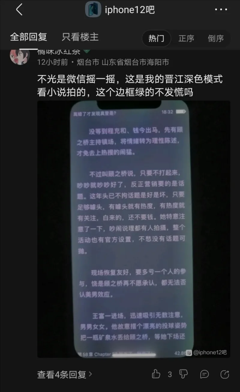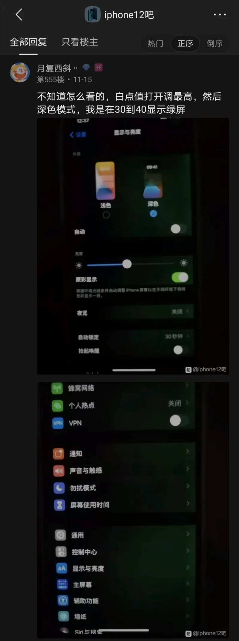 起因是一个用户发现自己屏幕过了14天退换期之后发现屏幕绿屏了,发出来分享。一开始评论区还充斥着欢乐的气息,比如什么又不是不能用啦,这个是oled正常现象啦之类的话语。但是底下的看客也测了测自己的屏幕,评论区就一发不可收拾了,一片环保绿。