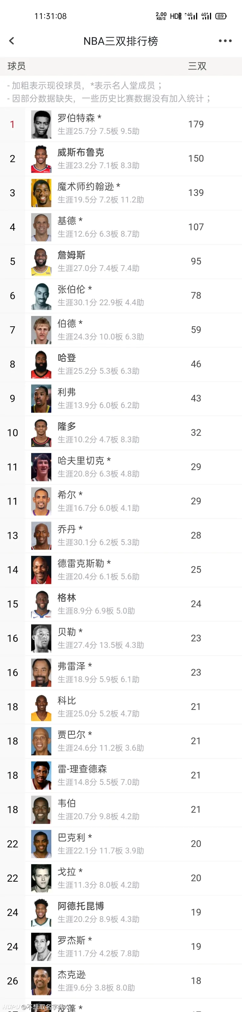 我滴个妈呀 他是第28个 那表里的27个三双比他多的人不都比他提前拿到20个三双?????????????????????????????????????????