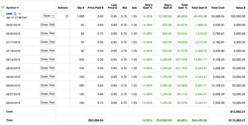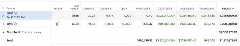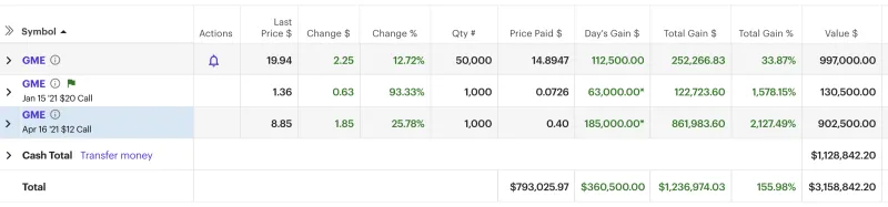 21年1月12号,GME股价来到接近20美元,这时DFV的GME 单股投资组合在一年里已经涨到了300万美元,并且还有价值100多万的1月15日20美元的看涨期权。