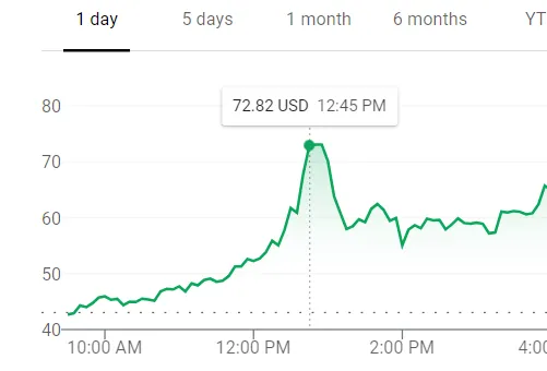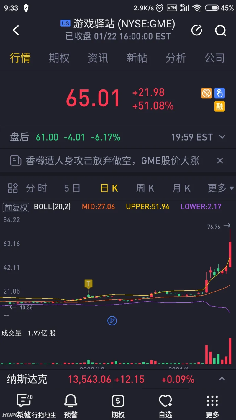 然而这不是疯狂的结束,只是疯狂的开始。经历了几天的抛售和止盈后,GME股价一直浮动在40左右。美国时间的今天22日,又是一个周五,又是一个期权截止日,各空投机构们又没等来股票的回落,只好忍痛继续买入。今早股价一路飙升70%,被熔断叫停。股价最高时交易价为73美元一股。