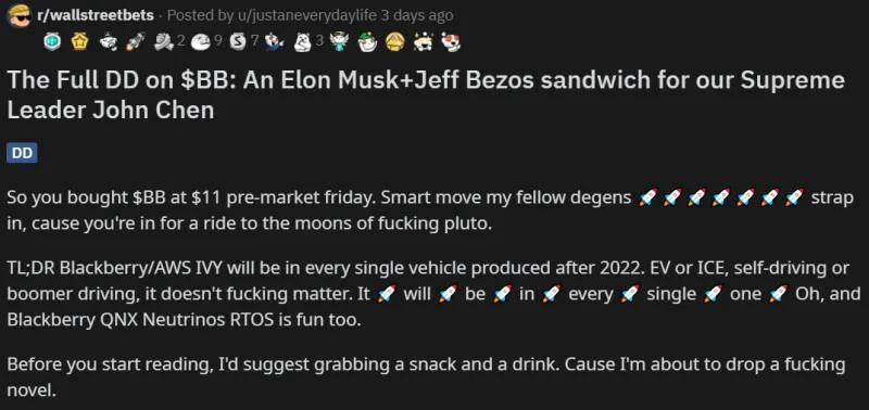 时不时有人会发贴晒出自己做的调查(DD贴)长篇大论讨论哪只股票是值得下注的目标,帖子里一定少不了一大堆的🚀🚀🚀🚀🚀🚀。
