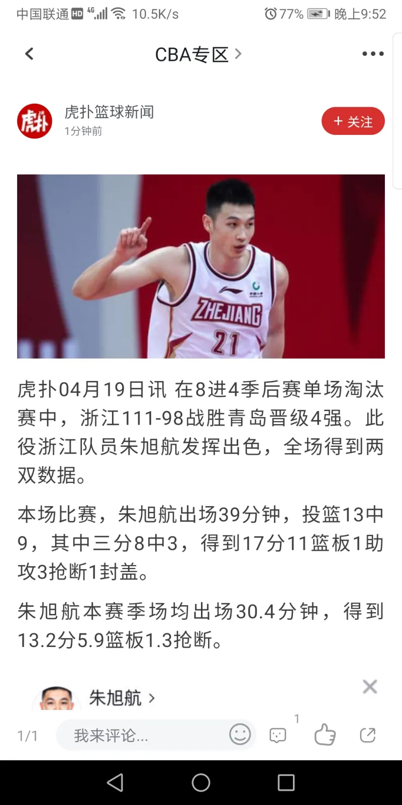 虎扑04月19日讯 在8进4季后赛单场淘汰赛中,浙江111-98战胜青岛晋级4强。此役浙江队员朱旭航发挥出色,全场得到两双数据。