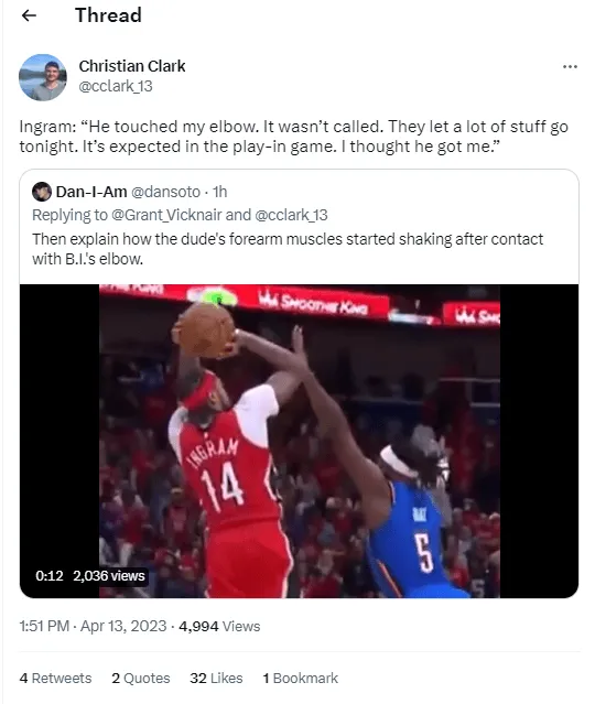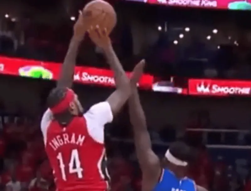 赛后英格拉姆接受采访时,谈到了最后时刻他出手的三分被雷霆球员犯规,但裁判没有吹罚。