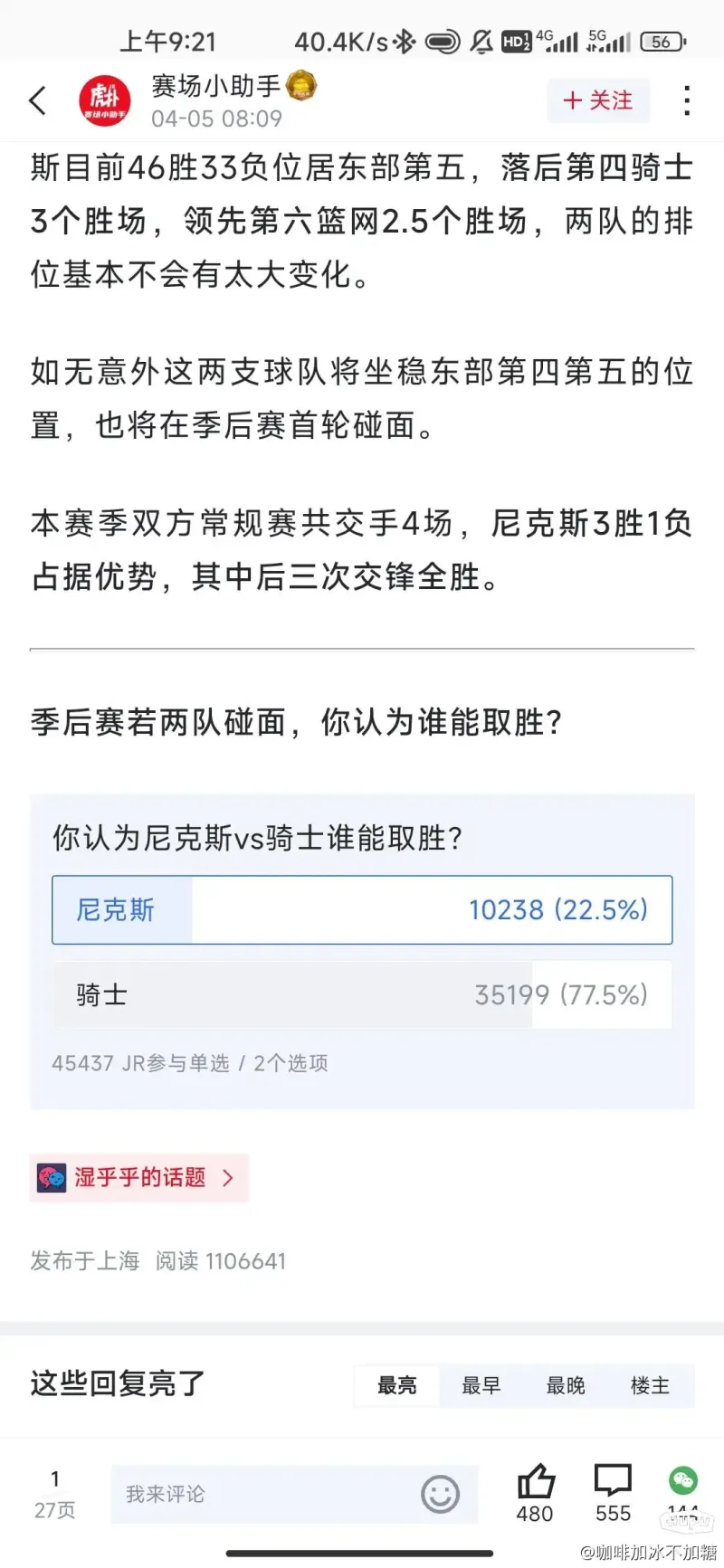 恭喜尼克斯晋级!!本来以为最势均力敌的一组对决,没想到来了个绅士横扫,布伦森是真的强!哈特加罗宾逊两个人抢的板和整个骑士一样多,骑士双塔是真的废,后场双枪也是不稳定,这球队看不到希望啊