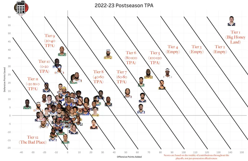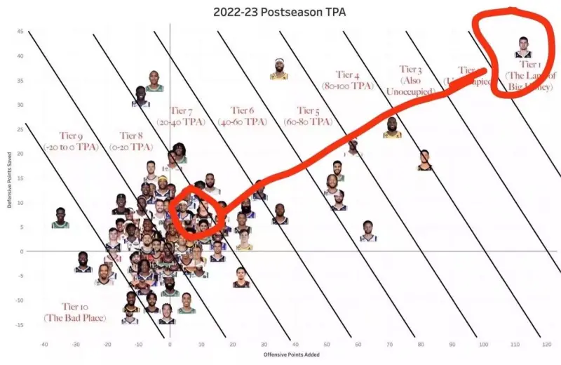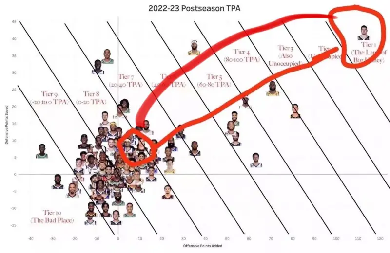虎扑06月14日讯 今日,数据媒体NBA Math发布了反映本次季后赛球员攻防综合影响力的TPA分布图。