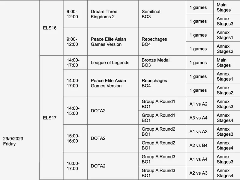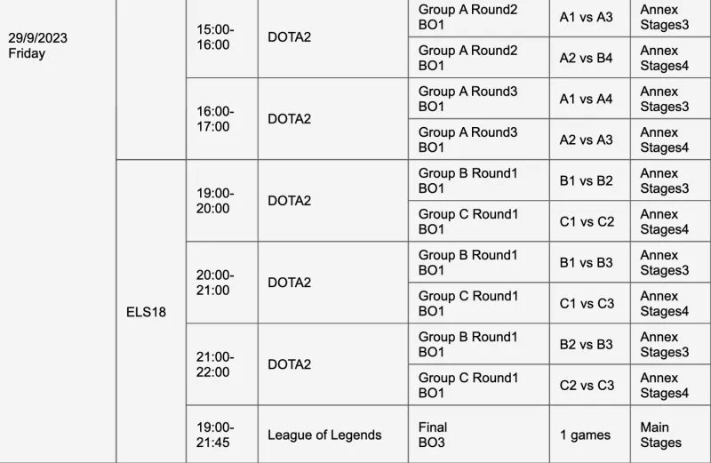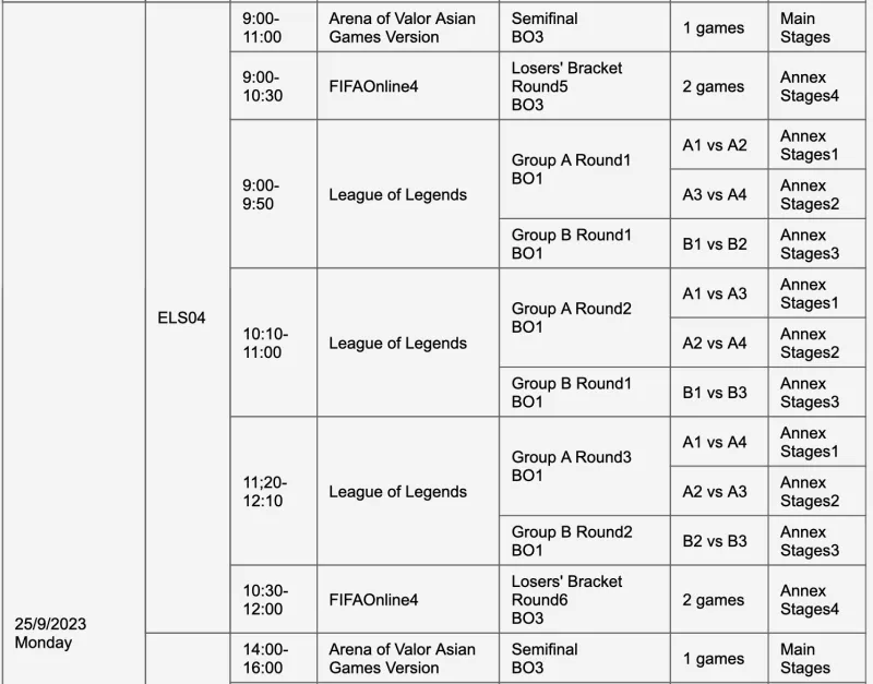 英雄联盟项目将于9月25日至9月29日举办,其中9月25-26日为小组赛,共分为ABCD四个小组,每个小组四支队伍,通过小组赛决出八强,9月27日四分之一决赛,9月28日半决赛,9月29日决赛。根据赛程表,淘汰赛也就是四分之一决赛到决赛均使用BO3赛制。