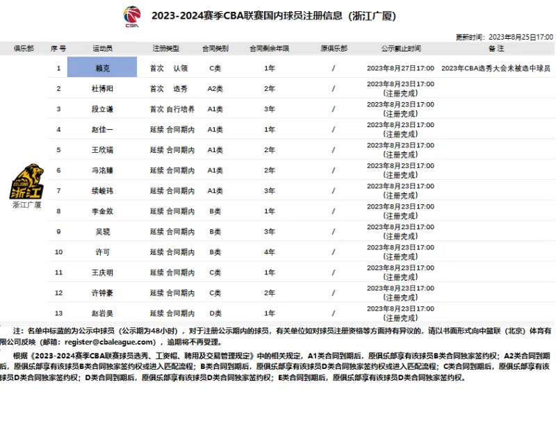 虎扑08月25日讯 CBA官方更新球员注册信息,广厦男篮1年C类合同认领落选秀赖克。