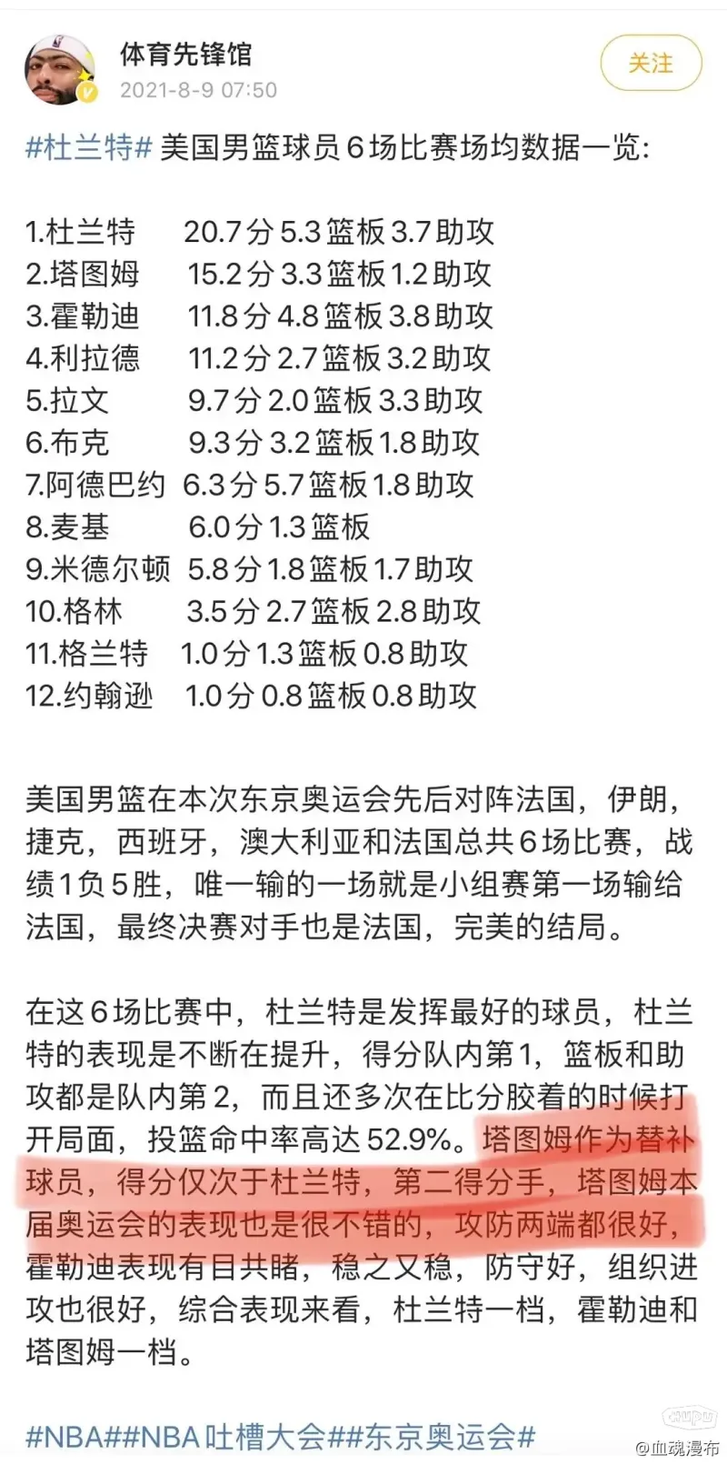 东京奥运会还有杜兰特来守住最后的脸面,明年不知道还有谁……塔图姆?