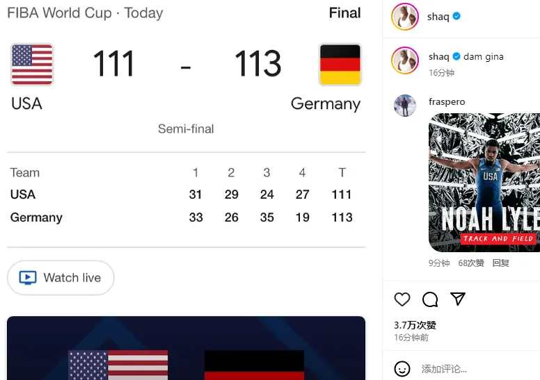 虎扑09月08日讯 篮球世界杯半决赛,德国全场113-111战胜美国,晋级决赛。