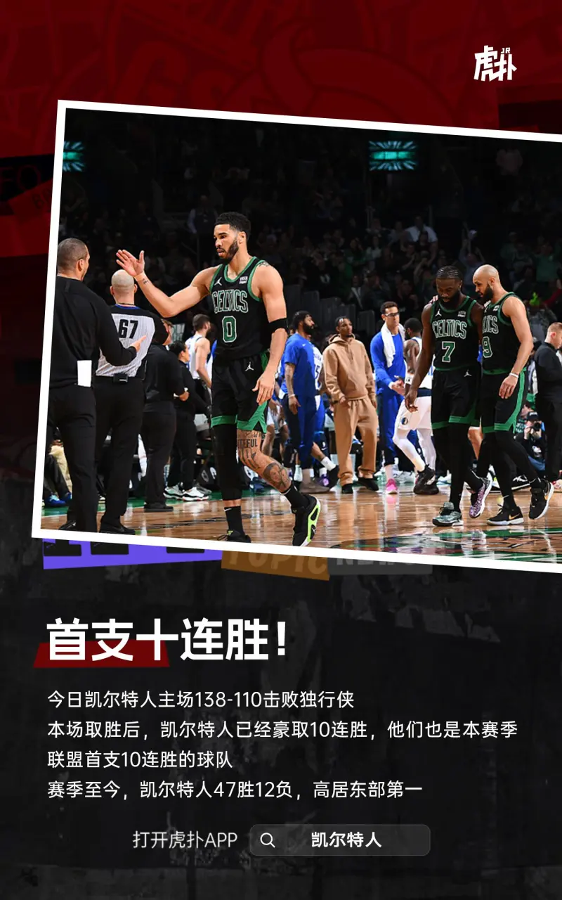 本场取胜后,凯尔特人已经豪取10连胜,他们也是本赛季联盟首支10连胜的球队。