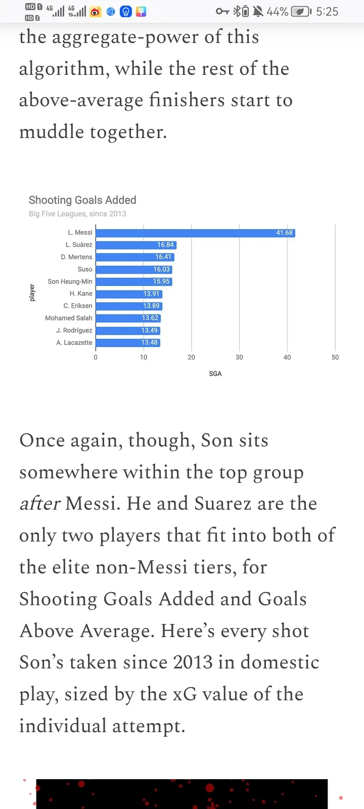 梅西究竟有多出色?至少在射门表现的统计中,他的表现是其他球员的将近3倍。