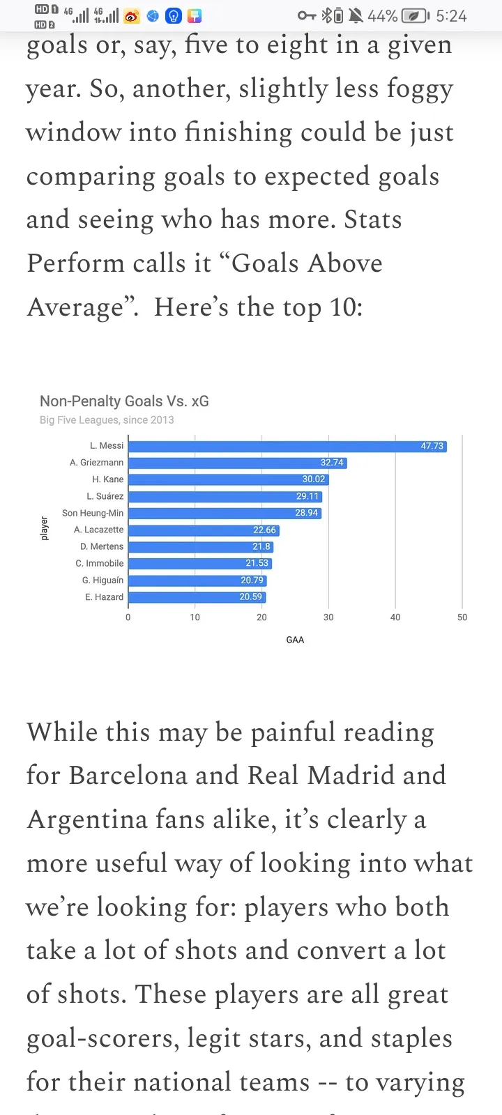 不过你知道吗?从期望进球的角度讲,他们两人的实际进球数要比预期的稍少一些。换句便于理解的话说,从数据分析的角度看,尽管进球数喜人,但他们两人的射门精度实际上是稍微拖了一点后腿的。当然这样的结论与很多球迷的认知有所区别,但统计数据给出的结论是这样的。