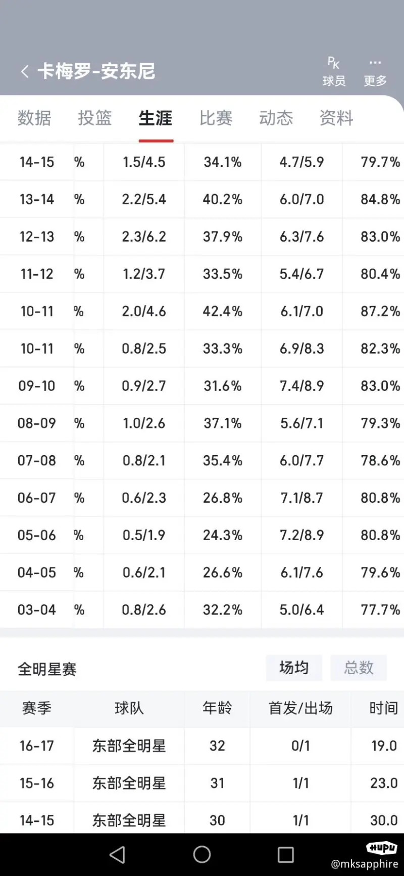 安东尼为尼克斯3个赛季打了21场季后赛比赛,布伦森目前2个赛季共19场。