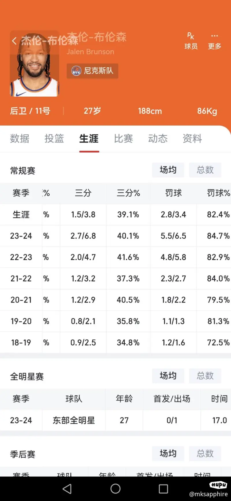 本场比赛,尼克斯球员杰伦-布伦森18中11,得到29分2板5助。