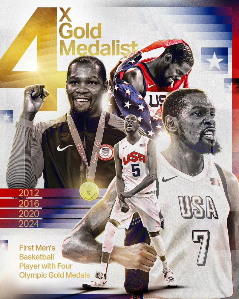 至此,美国球员凯文-杜兰特成为历史首位收获4枚奥运金牌的男篮运动员。