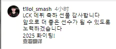 "感谢大家送给我的祝贺LCK出道礼物。我会努力成为一名更加优秀的选手,2025加油!"