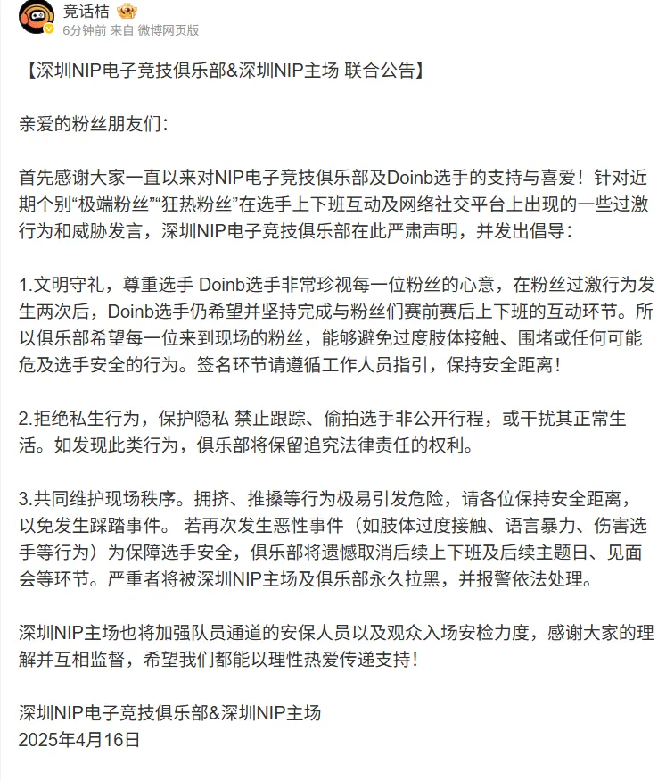 虎扑04月16日讯 深圳NIP电子竞技俱乐部&深圳NIP主场发布联合公告,原文如下: