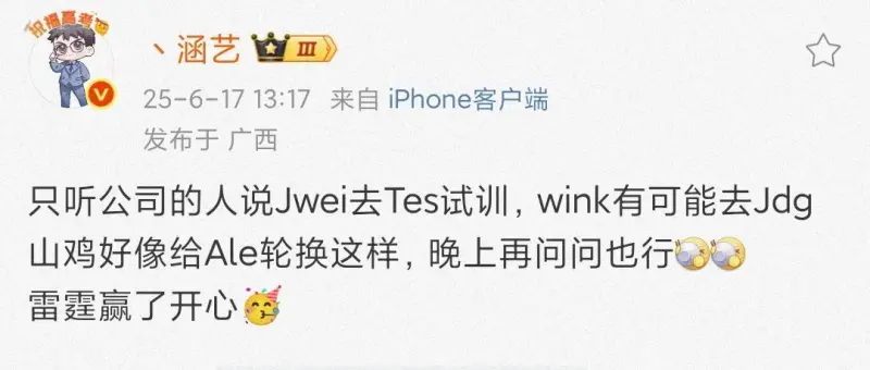 涵艺:只听公司的人说Jwei去Tes试训,wink有可能去Jdg 山鸡好像给Ale轮换这样,晚上再问问也行