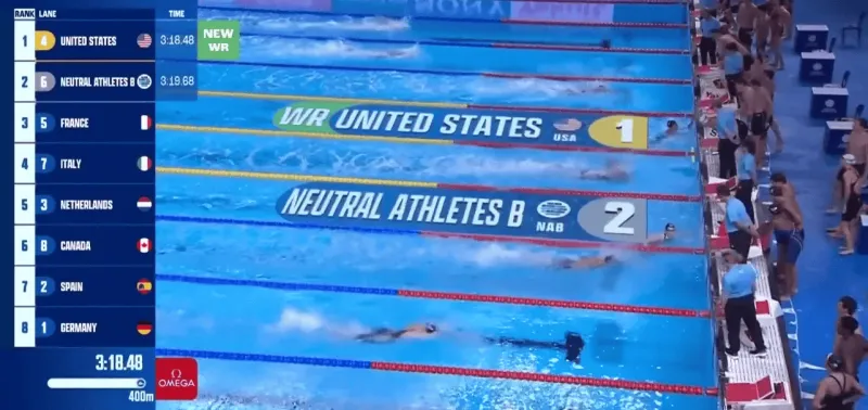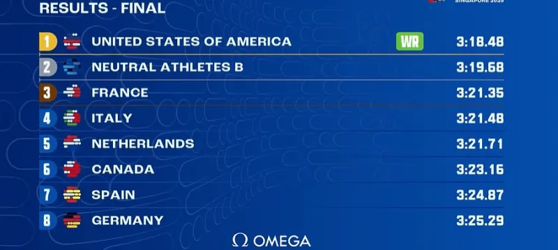 中立运动员B队(俄罗斯) 3:19.68获得银牌,法国队3:21.35获得铜牌。在上午的预赛中,中国队排名第10无缘决赛。