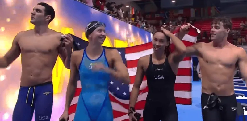 虎扑08月02日讯 刚刚结束的世锦赛男女4x100米自由泳接力决赛,美国队美国队3:18.48,打破世界纪录夺冠。这也是美国队在本届世锦赛拿到的首枚接力金牌。