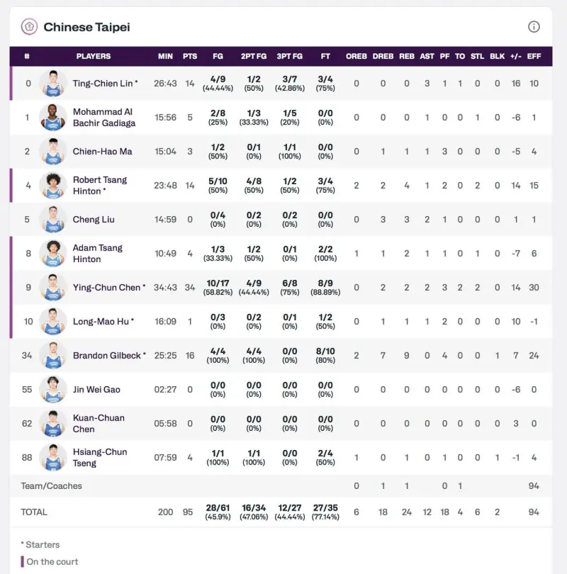 這一戰,陳盈駿奠定了台灣歷史最佳控球的位置,以近60%的命中率,全場砍下34分、2助攻、2籃板、2抄截。