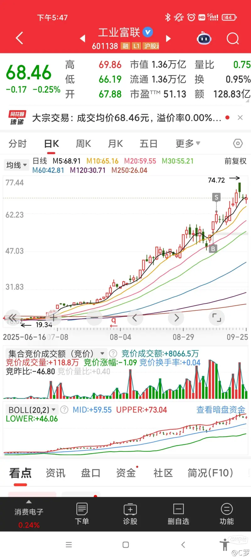 首先感谢@天园地放 老师分析的查询每日集合竞价成交量/手数的方法,我是手机ths,点击某个股日K,在日K图下方的第一、第二副图点击指标,就会出现指标广场-K线指标切换的页面,我默认是没有集合竞价的,要点击“指标广场”,在搜索栏里搜索集合竞价指标安装,然后就可以选择了,这个指标都是作者自己上传的,所以也有可能有误差,我验证了几个应该结果接近的,应该没问题了。其次想和大家请教一下最近老师们经常说的竞价爆量问题,这个指标其实只反映了某一时间的成交,和其他时段的成交是一样的,有时候爆量也是坑人。举个例子,工业复联8月7日这天,竞价是爆量的,但是开盘从冲到9.45%回落到收盘3.94%,再到9月4日,也是竞价爆量,从7.82%到尾盘-2.05%,然后是9月10日、11日,也是竞价爆量,这里就是两连板了。其他的图形我还在继续看看,目前看了几个都是类似观点,请华福老师,还有各位老师指点,竞价爆量结合哪些技术一起看,比较靠谱?