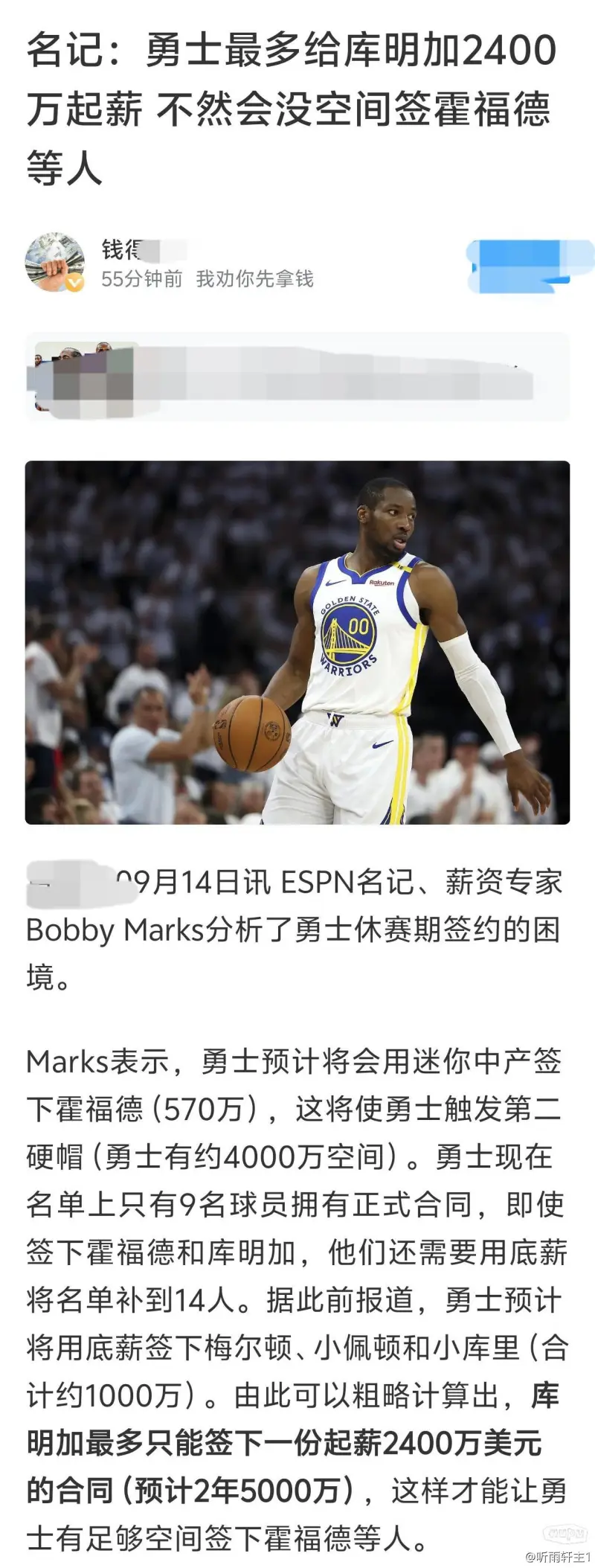 截至2025年9月14日,勇士队最新9名球员薪资1.705亿,假如按之前口头承诺签约霍福德、梅尔顿等4名老将,13人总薪资1.831亿距离2.078亿第二土豪线仅2470万美元,也是勇士队目前最高续约库明加的钱。