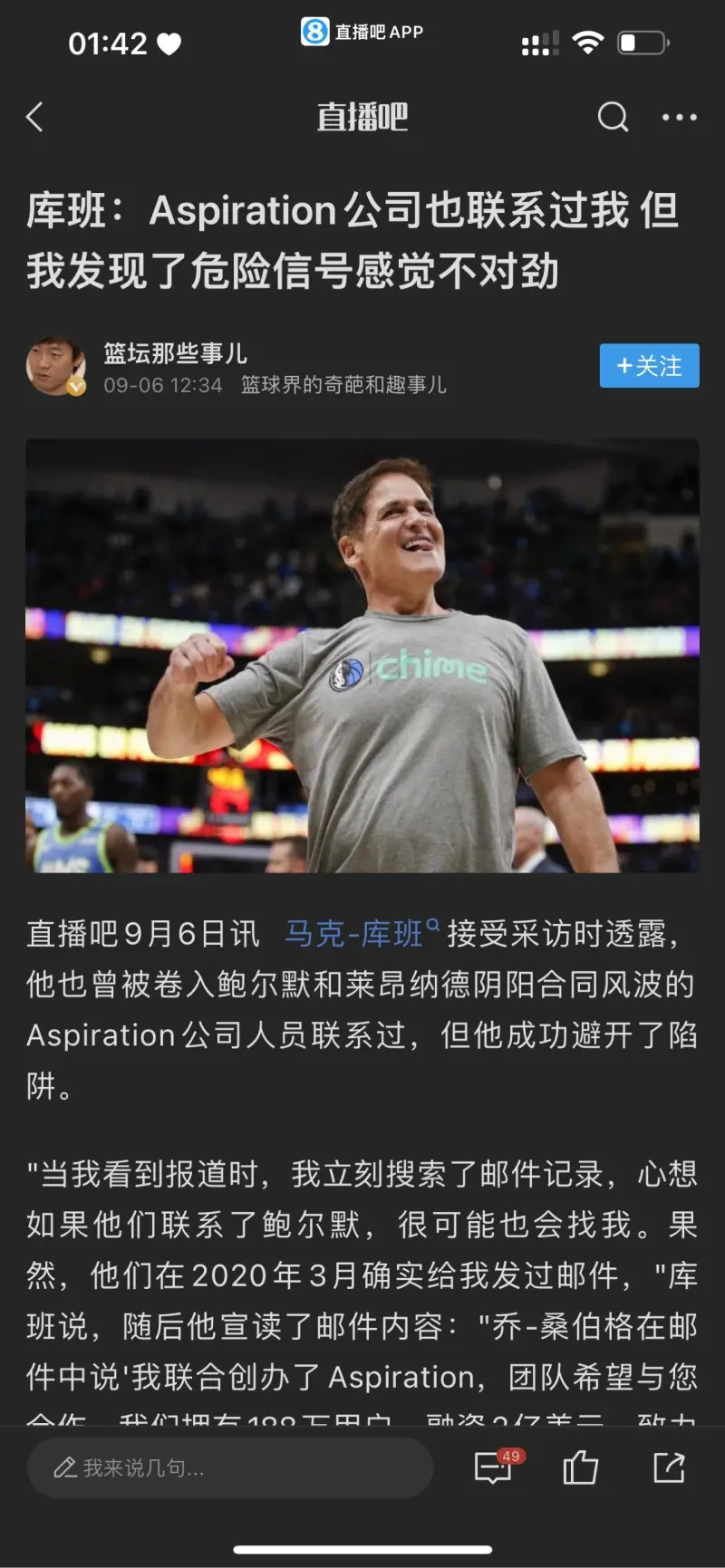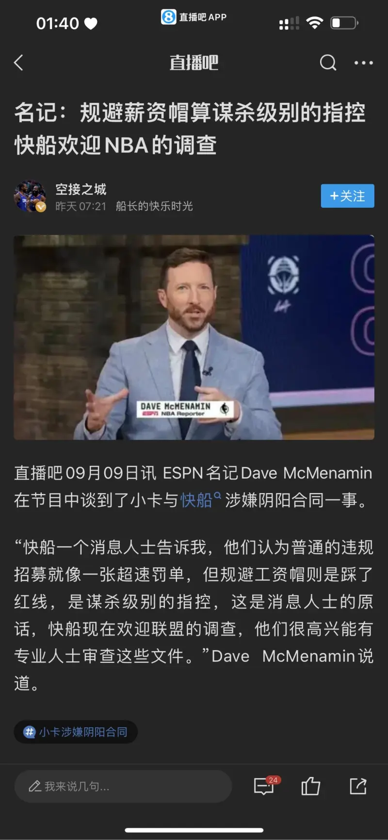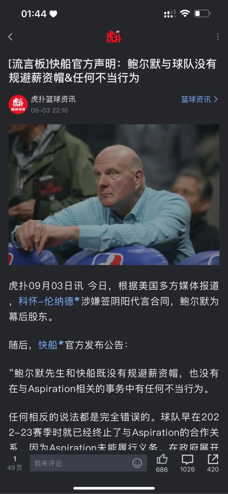你连鲍尔默说啥你都不知道,那你在这回复啥?鲍尔默说了他被骗了,投资了这个公司,至于这个公司和小卡的合同,是他们之间事情,这不是否认他给小卡塞钱了?快船官方也进行了回应。shams也说了是咋回事,自己不会看?