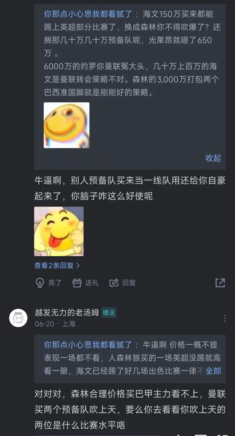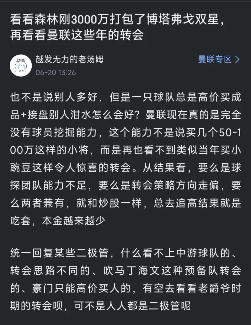 没啥可嘲讽曼联的,生态位不一样,环境也不一样,森林的情况是上个赛季只有一套阵容阵容能用,替补基本差了不止一个档次,至于森林买的人,除了恩多耶,热苏斯之外,暂时没看出来哪个是高级货(或者说是未来可期)。最离谱的是,左后卫是没替补的,一直都是内科一个人撑着(个人觉得内科的能力也有限),应该在转会窗早期加一个能轮换的替补,结果都是转会期结束才进的,而且这两的实力存疑,所以很难评价是不是为了宫斗才整这么一出,