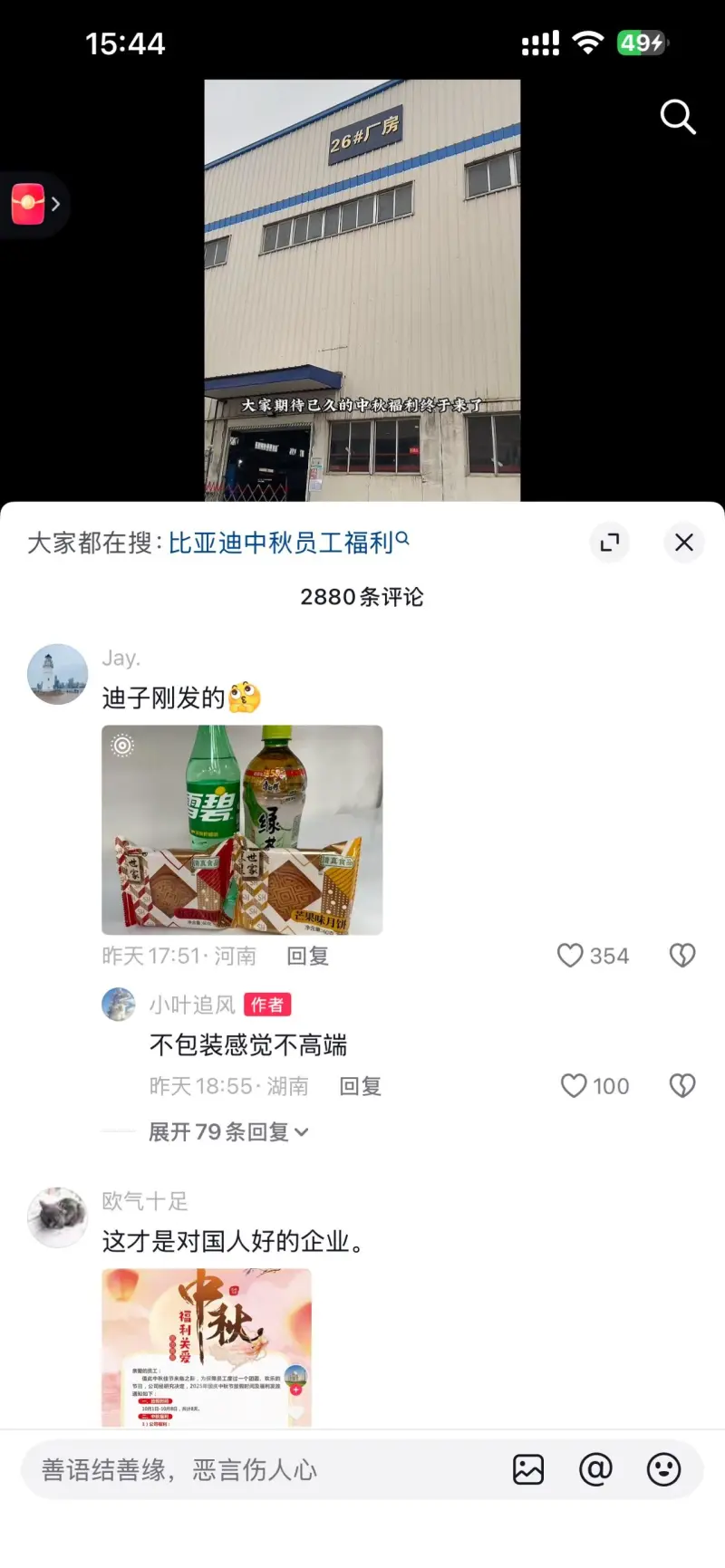 今天在抖音刷到,中秋节礼物,2个月饼 一盒豆奶 一盒小甜水, 比一些20人的企业还抠门,我们公司都发了200的购物卡