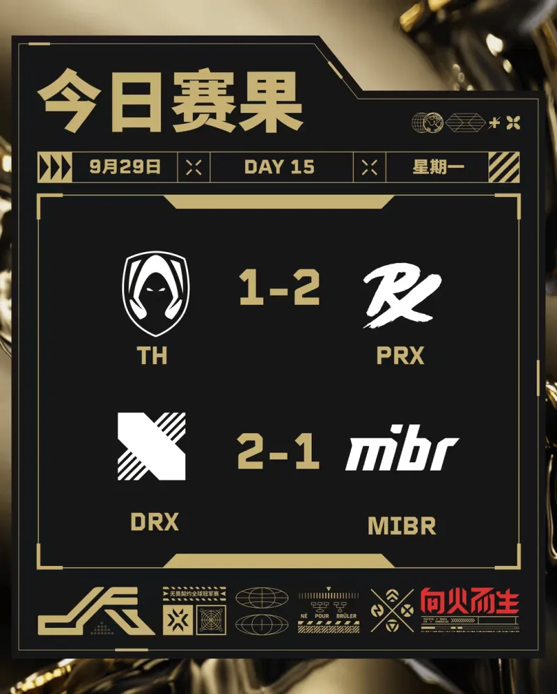 2025年巴黎冠军赛第十五日的比赛已经结束,PRX以2-1的比分击败TH,DRX以2-1的比分击败mibr。
