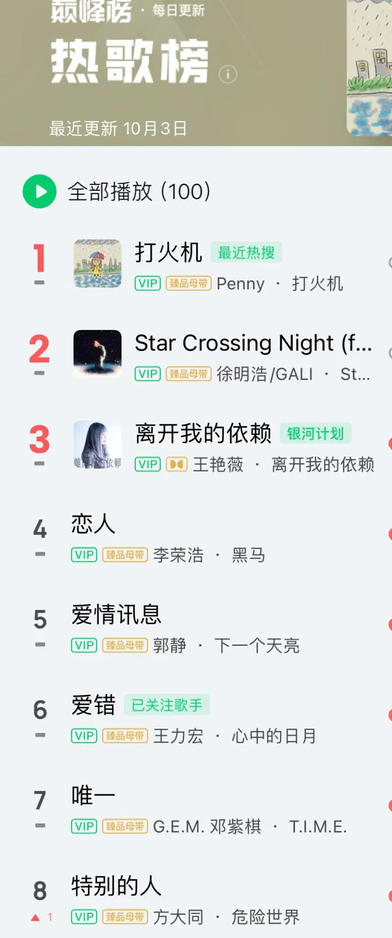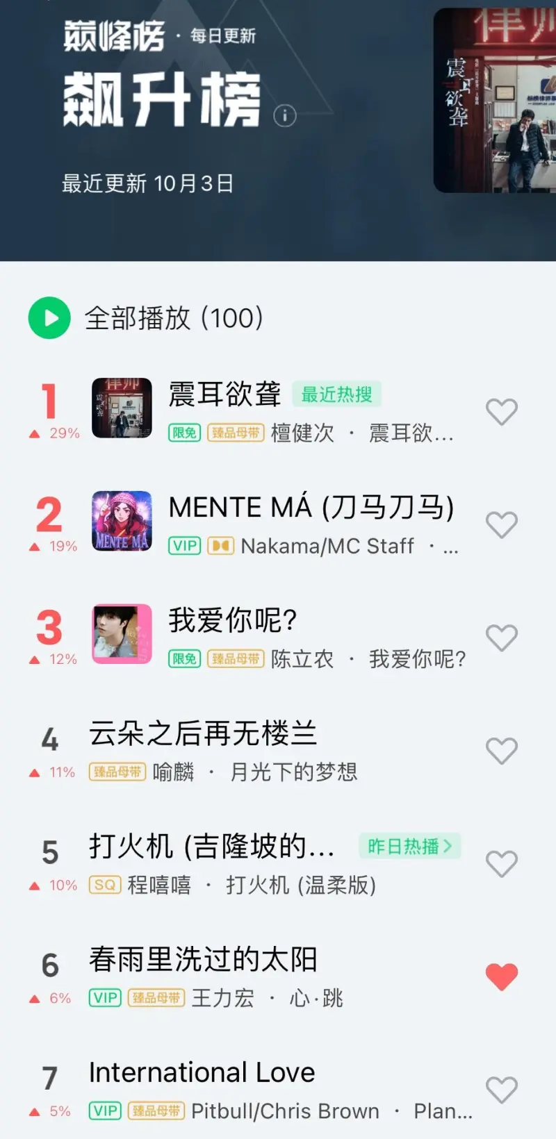 天地龙鳞在国庆期间又爆了。深圳五天连唱也很high。马哥的Q音歌手排名今天还涨了。当然爱错在热歌榜继续前十前五(一整年了都)
