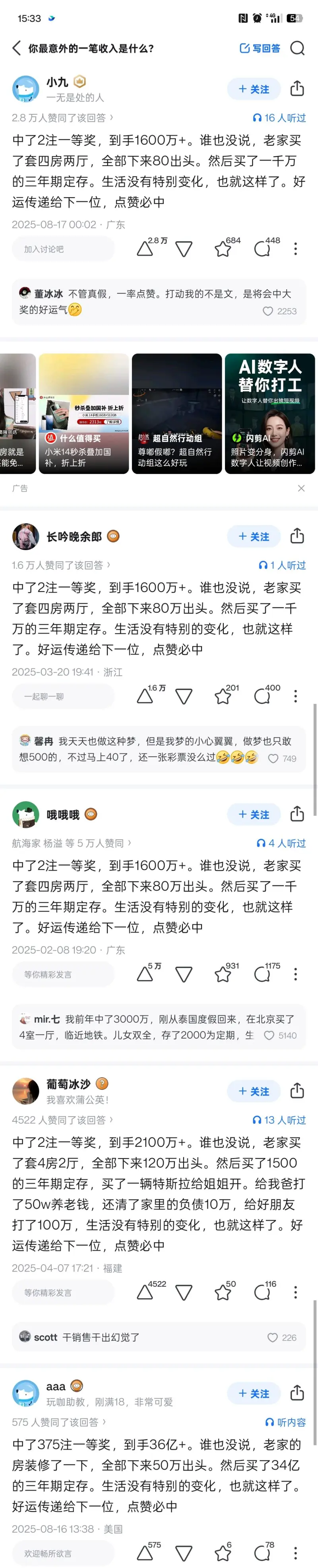 中了20注一等奖,到手16000万+。谁也没说,老家买了套四房两厅,全部下来800出头。然后买了一千万的三年期定存。生活没有特别变化,也就这样了。好运传递给下一位,点赞必中