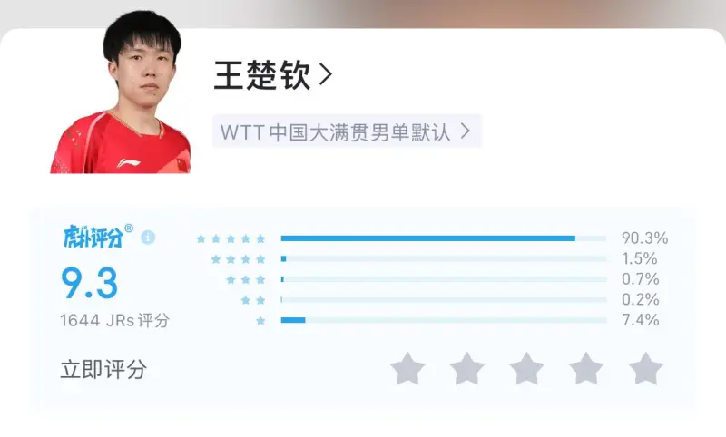 在男单决赛的赛后评分中,王楚钦的赛后评分高达9.3分。