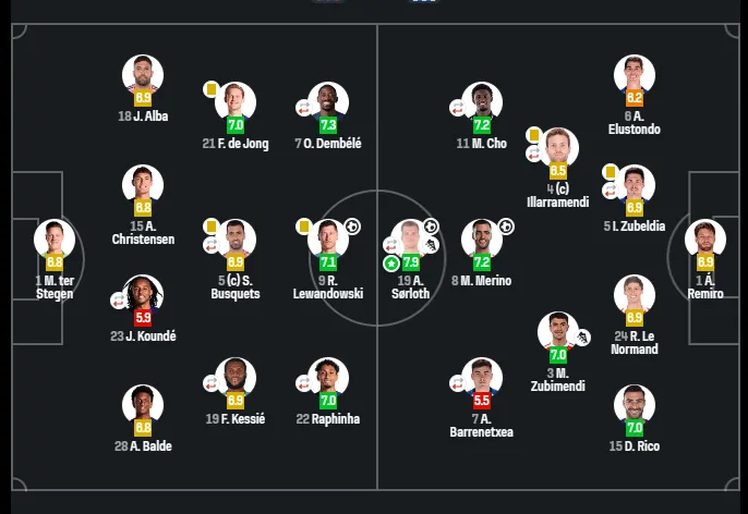 第35轮,提前4轮夺冠的第一轮,对阵皇家社会。阿尔巴回到了首发,孔德踢上了他心心念念的中卫,绝杀皇马但几乎肯定会被摆上货架的凯西踢上了首发,拉菲尼亚回到了他坚持认为自己最能发挥的右路。巴萨最终1比2输球