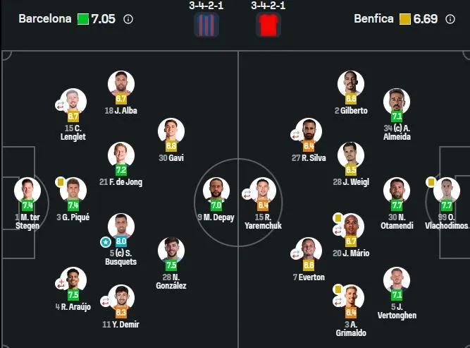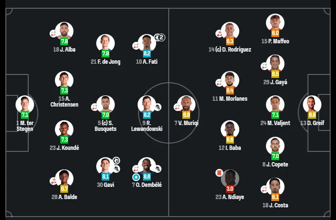 37轮巴萨的主场告别战,也是暂时与诺坎普告别的一战。久疏战阵的阿尔巴与老伙计布斯克茨联袂首发,这就是他们红蓝生涯的终结了。给阿尔巴让出位置的是拉玛西亚新星巴尔德,布斯克茨身侧的是传射建功的拉玛西亚新任金童加维,锋线上与莱万搭档两翼的是哈维拯救职业生涯的游戏机少年登贝莱,左侧梅开二度的是命运多舛的天才法蒂。