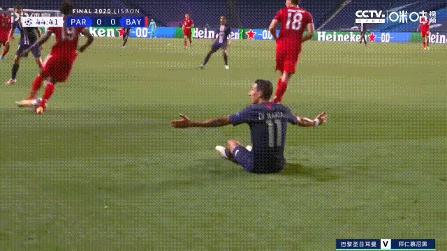 拜仁后防压迫看球不看人,巴黎打出配合后空位迪马利亚天残右脚半单刀打飞