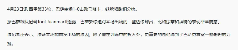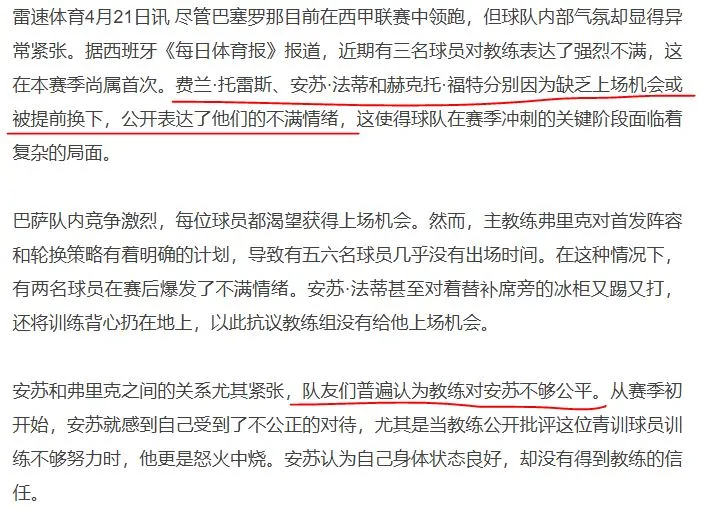 更衣室不满了知道上弃将了?弗里克7月刚到巴萨时评价法蒂训练非常出色,第二年初解释弃用法蒂的时候改口说训练不努力了?踢多特亚马尔主动下场要求法蒂上场,赛后弗里克又改口说法蒂训练表现很好应当得到出场机会。然而继续继续弃用直至逼迫离队在摩纳哥三场四球当选月最佳。前后矛盾是有什么改变了还是说谎了?