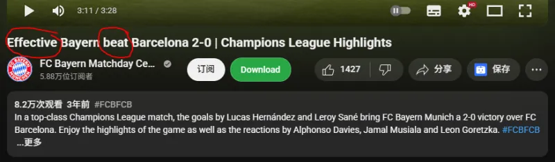 不仅如此,拜仁youtube人员还非常鸡贼的使用了“高效”的形容拜仁在集锦里四次威胁进攻两次是远射剩下两次是进球。以及有意使用双关词“beat”。